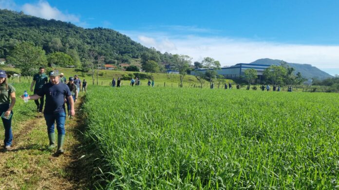 Com o objetivo de aperfeiçoar o conhecimento técnico dos produtores rurais que participam da Assistência Técnica e Gerencial (ATeG) na área de Pecuária de Corte e fomentar práticas eficientes de manejo de pastagens, o Sistema Faesc/Senar e o Sindicato Rural de Jaguaruna promoveram, neste mês, um Dia de Campo com foco na implantação e manejo de pastagens perenes, especialmente do capim Tangola. O encontro foi realizado na Fazenda Respingo, em Tubarão, na propriedade do produtor Egídio Goulart, e contou com a participação de aproximadamente 45 pessoas.