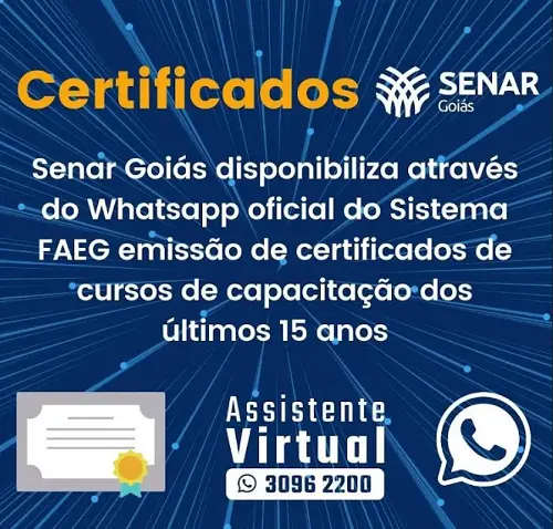 Você já participou de algum curso do Senar Goiás e não pegou o certificado? O Sistema Faeg/Senar, através do Campo Lab, agora disponibiliza os comprovantes referentes aos treinamentos realizados nos últimos 15 anos de forma mais dinâmica. Tudo através da assistente virtual.